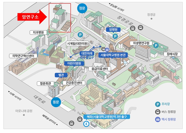 서울대학교병원 병원 주차장은 주차 지원이 되지 않습니다. 행사 참석자께서는 암연구소 건물 내부 주차장을 이용해 주시기 바랍니다.